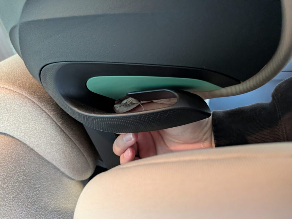​まずは、ヘッドレストの後ろにあるレバーを操作して、一番上までグッと引き上げます。